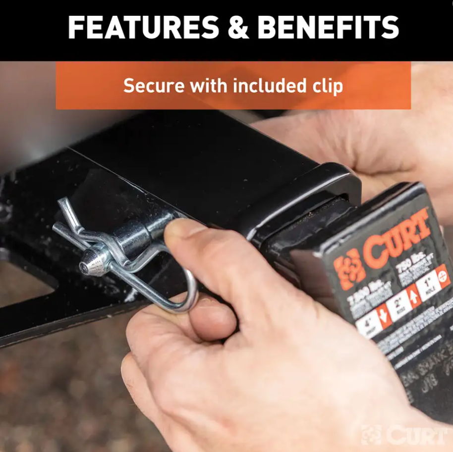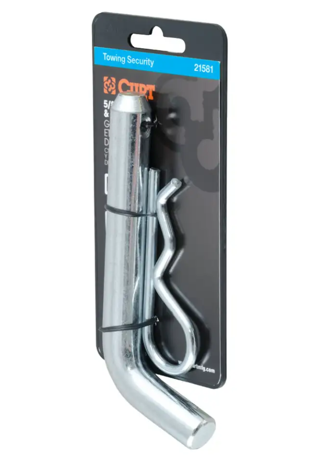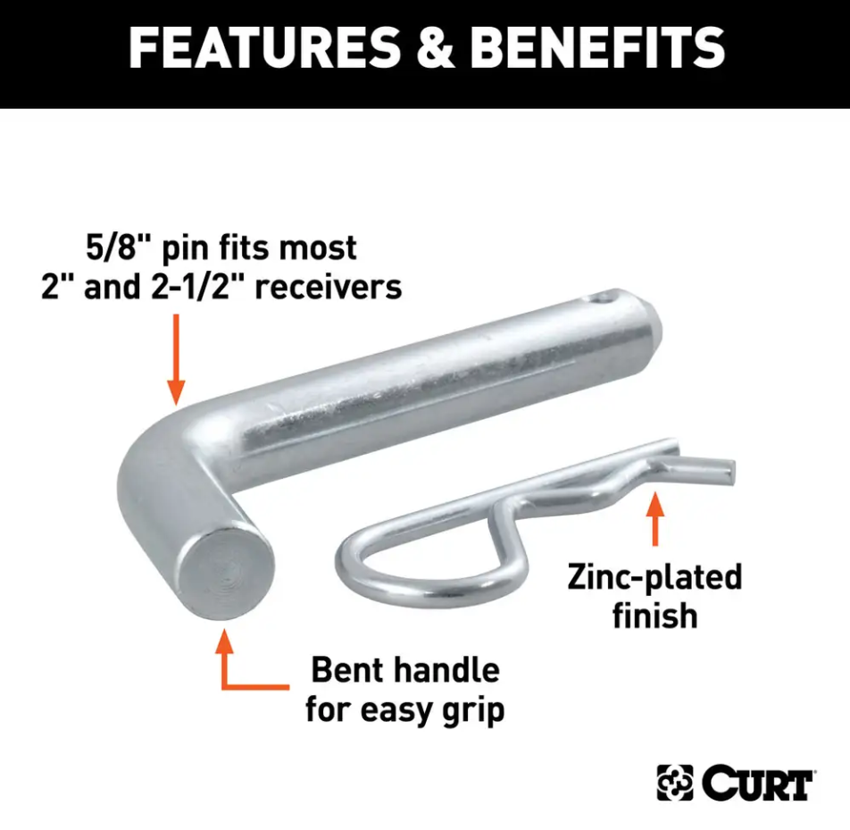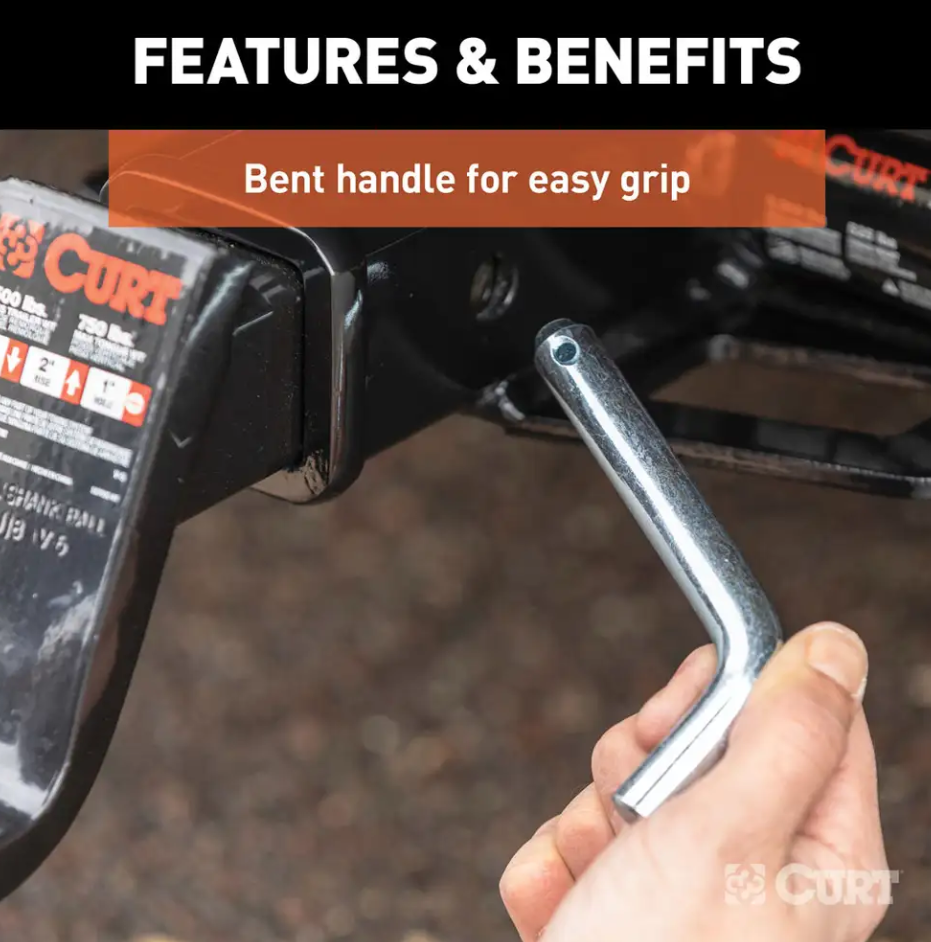 When you mount a ball mount on your trailer hitch, you expect it to stay put. Whatever type of load you are hauling, having towing equipment that can work as hard as you do is a must. For all types of heavy-duty towing, CURT 5/8" hitch pins and clips pack a little extra punch. We make our 5/8" hitch pins out of solid steel and coat them in one of four finish options. All of these finishes offer excellent resistance to rust and corrosion for long-lasting, smooth operation. CURT hitch pins are also constructed with a 105-degree bend, creating a useful handle for a better grip and allowing the pin to stay securely engaged in the trailer hitch and ball mount.