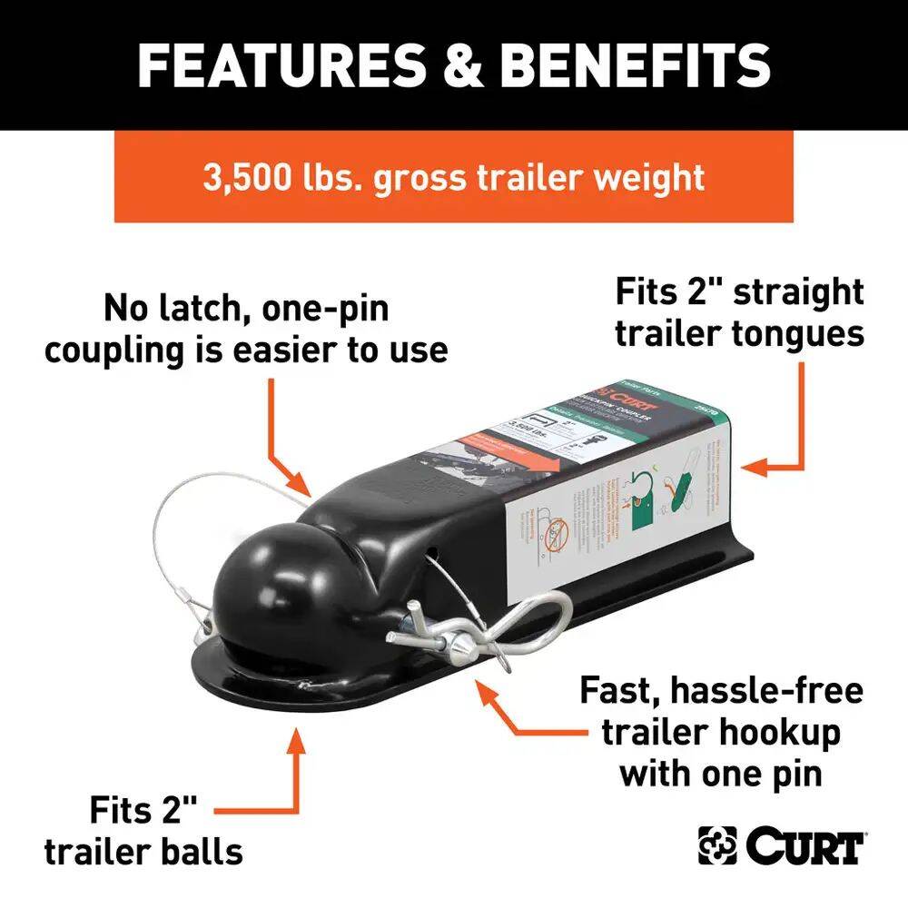 The QuickPin™ trailer hitch coupler is fully tested according to SAE J684 specifications, ensuring that the coupler is safe and reliable to tow your trailer. This model is rated for 3,500 lbs. gross trailer weight. It accepts a standard 2" diameter trailer ball and can be mounted onto a 2" wide trailer tongue beam. It is compatible with most existing coupler mounting hole configurations. The QuickPin™ trailer tongue coupler comes with a 1/2" pin for securing the ball mount connection. This pin must be used for hookup and cannot be replaced with aSpecifications