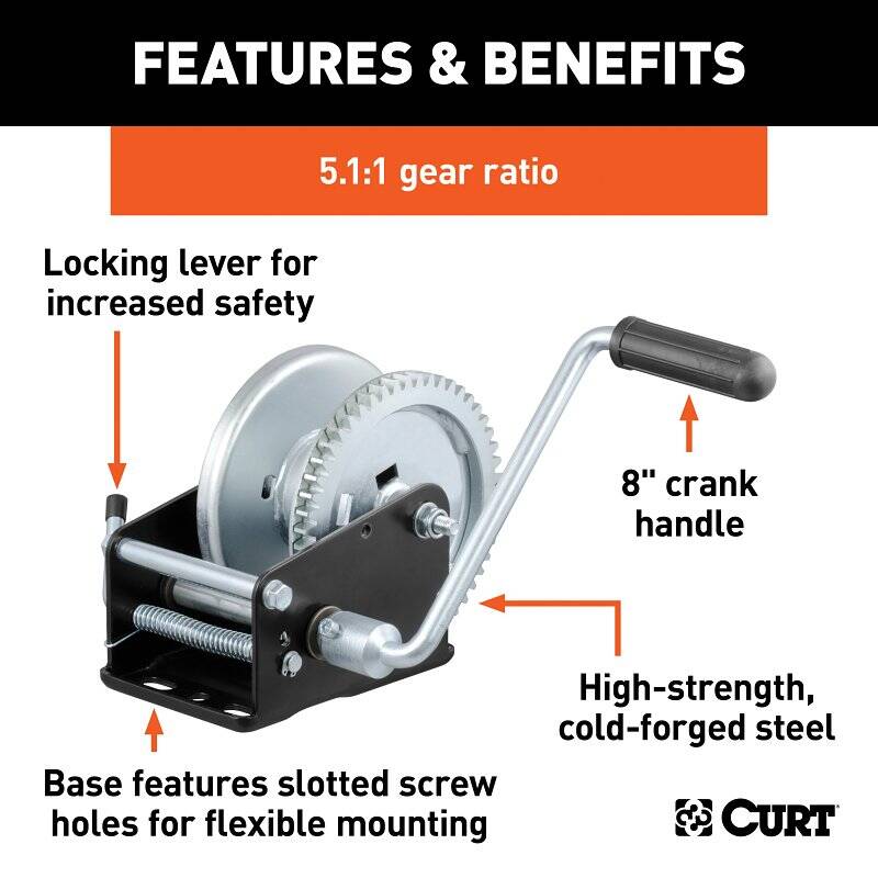 After a full day on the water, you and your crew are tired. It doesn't matter if you were swimming off the back of the pontoon boat, racing around the lake in your speed boat or just casting a line off the side of your fishing boat - when you get to shore, the last thing you want to deal with is a faulty hand crank on your boat trailer. You want a winch that makes your job easy and that lets you get out of the marina and back home sooner. Curt hand winches are constructed from cold-forged steel to provide structurally great pinions and eliminate gear-to-shaft bonding failures. They are designed to be mounted on a variety of trailers and are especially useful for boat trailers. Curt boat winches can also serve a number other winch applications, though they are not designed for vehicle towing. This Curt hand winch or boat winch features a capacity of 1,900 lb with a gear ratio of 5.1:1. It has a hub Dia of 1 in and a handle length of 8 in.