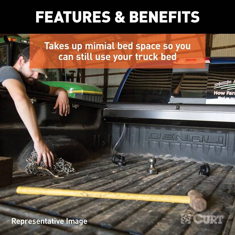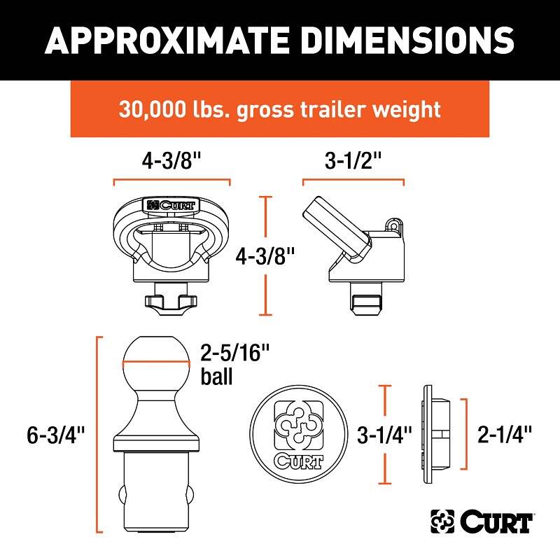 The Curt Ram gooseneck ball kit allows you to instantly outfit your pickup truck for gooseneck towing. This 30K kit includes a gooseneck ball and gooseneck safety chain loops that easily drop into the factory gooseneck hitch puck system on Ram trucks with the 5th wheel gooseneck hitch prep package. The components also come in a durable carrying case for convenient storage when not in use. The Ram gooseneck ball in this kit features a patented design. It is equipped with a simple lever and retainer balls that allow it to easily drop into the gooseneck hitch center puck and lock into place with a simple quarter turn. The gooseneck ball has a 2-5/16 in Dia and is rated for 30,000 lb GTW and 7500 lb vertical load. For dependable strength and safety, the gooseneck ball is constructed from forged and machined steel alloy, finished in a polished chrome plating and thoroughly tested to U.S. VESC V-19 specifications.