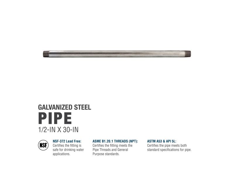 Galvanized nipples and pipe offer a trusted and easy method of transporting plumbing mediums. General uses for this product are for transporting potable water, compressed air, drainage or to create your own DIY projects. This class of pipe is designed for use with other galvanized fittings. Plastic caps are added at each end to better protect the threads during transportation.