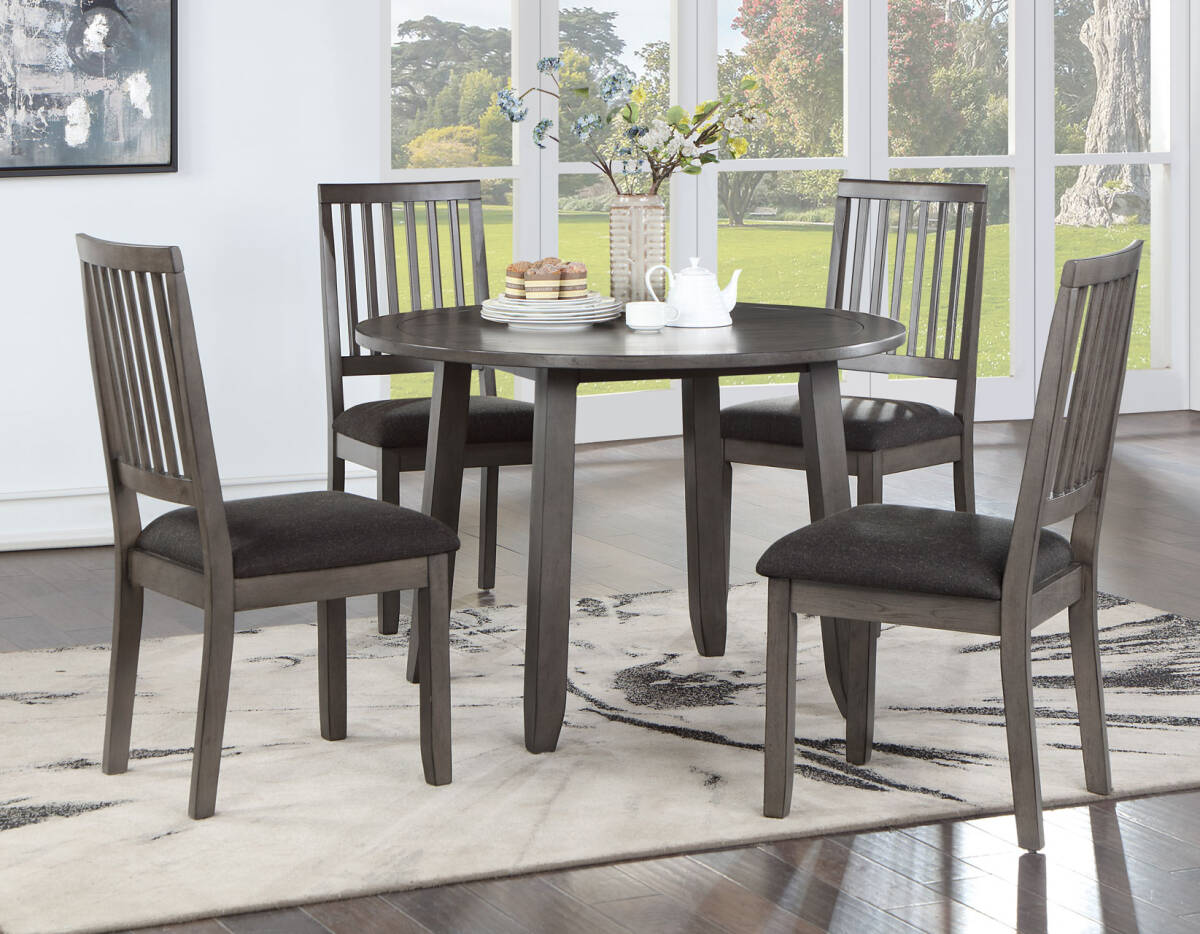 Yorktown adds style to small area dining with this 5-Pack dinette set. Transitionally styled with mid-century modern influences, Yorktown features a lustrous gray finish over mindi veneers in a 42-inch round table that is both cozy and functional. Solid wood chairs are upholstered in a modern gray tweed for a comfortable seat and feature vertical slat backs and tapered legs that complement the canted tapered legs of the table.