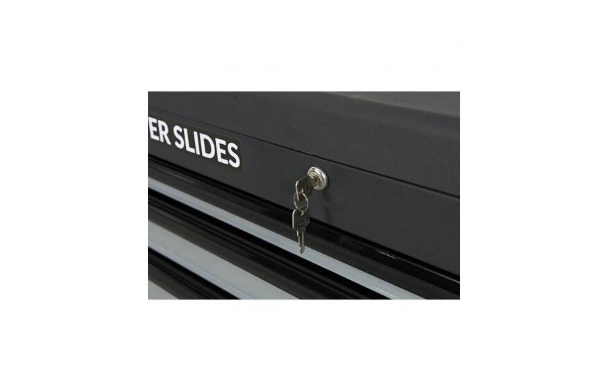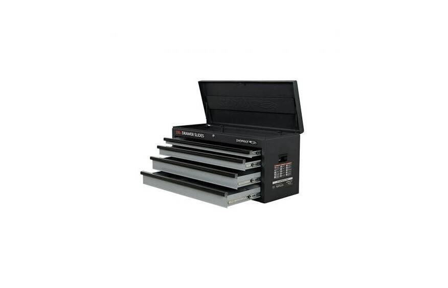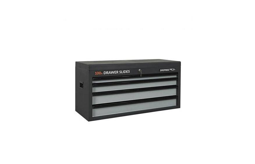 Four wide drawers of varying depths let you organize your tools the way you want in the SHOPMAX® 41-in. 4-Drawer Top Tool Chest. With a total holding space of 9,471 cu. in., you can organize everything you need for any-sized project. Two recessed, aluminum side handles help you lift and move the total chest capacity of 600 lb. Get extra-heavy usage with an all-welded, 20 ga. steel construction. Smooth-gliding ball-bearing drawer slides can handle up to 100 lb each, and keep your tools in place when opening/closing. The built-in secure latch mechanism prevents the doors from opening when moving the chest. The lid is reinforced with a sturdy, stamped Shopmax logo. Paint is a rust-resistant composition finished with a rugged, non-scratching rough finish.