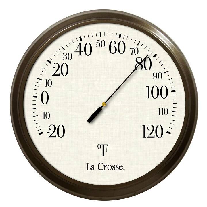 Stylish 8 inch Analog thermometer is the perfect solution for that indoor or outdoor space. Measures in Fahrenheit, weather resistant and a UV protected dial to prevent fading.