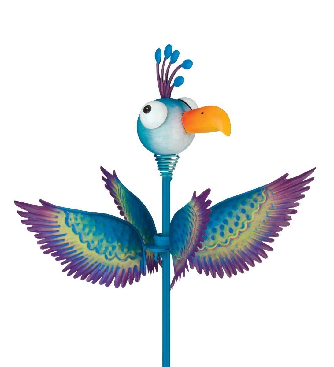 Goofy birds with textured wings. Get dizzy with delight watching these bright birds whirl in the breeze.