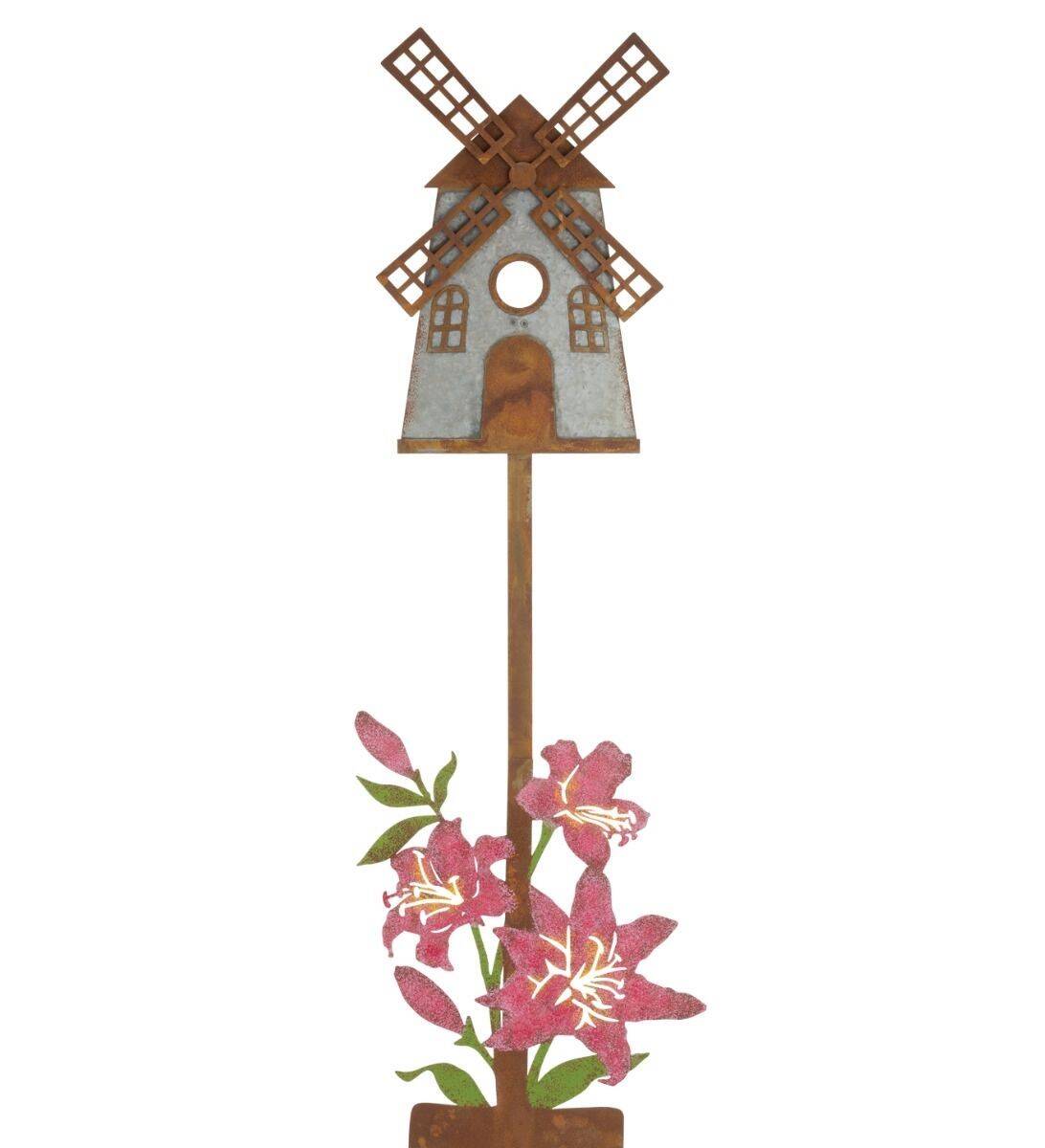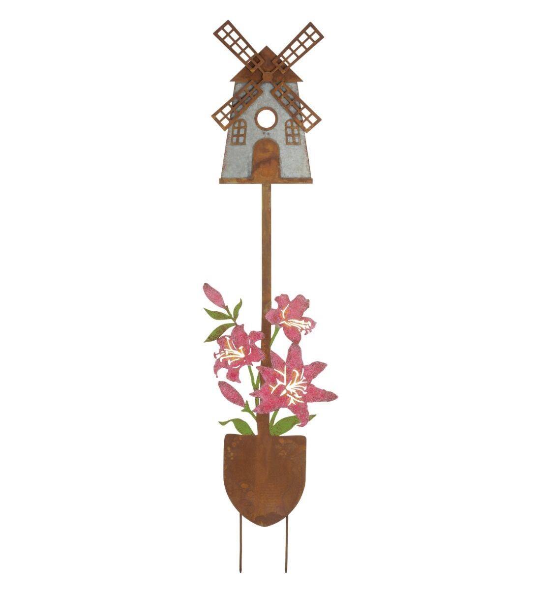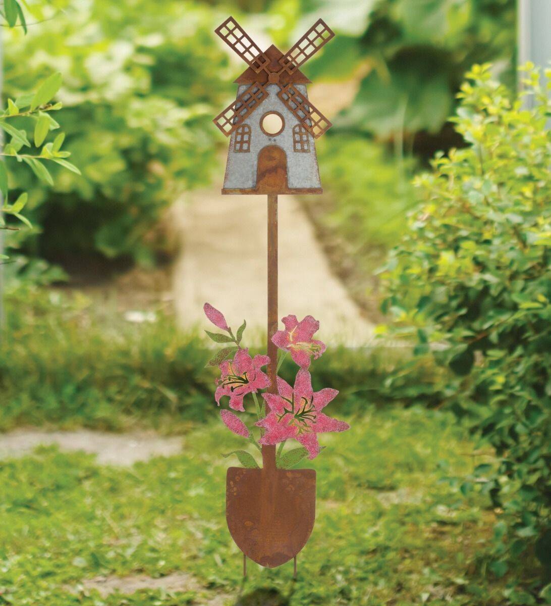 The Rustic Birdhouse Stake Windmill is a decorative metal garden accent designed to add vintage charm and motion to outdoor spaces, perfect for anyone wanting a whimsical focal point in a yard or flower bed. Standing 45-Inch tall with an 11-inch width, its multi-color, rustic finish creates a farmhouse look that complements perennials, borders, and walkways. Constructed of metal and finished with weather- and fade-resistant paint, this stake is made to hold its color and character outdoors season after season. The built-in windmill element brings gentle movement on breezy days while the birdhouse styling adds nostalgic appeal among shrubs and planters. Use it to enliven a patio planting, mark a garden path, or simply introduce a playful, rustic touch to your landscape.