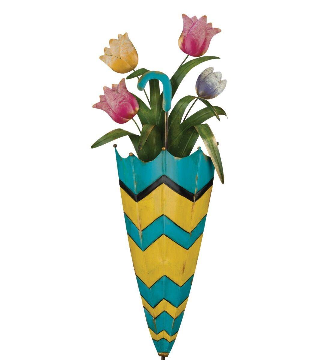 Highly dimensional metal Umbrella Garden Stake that serves as a vase for a bouquet of colorful flowers.