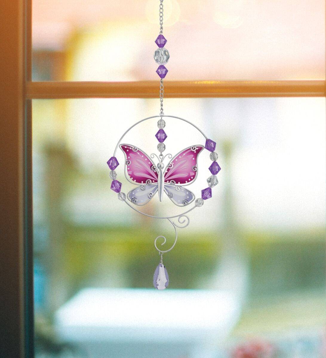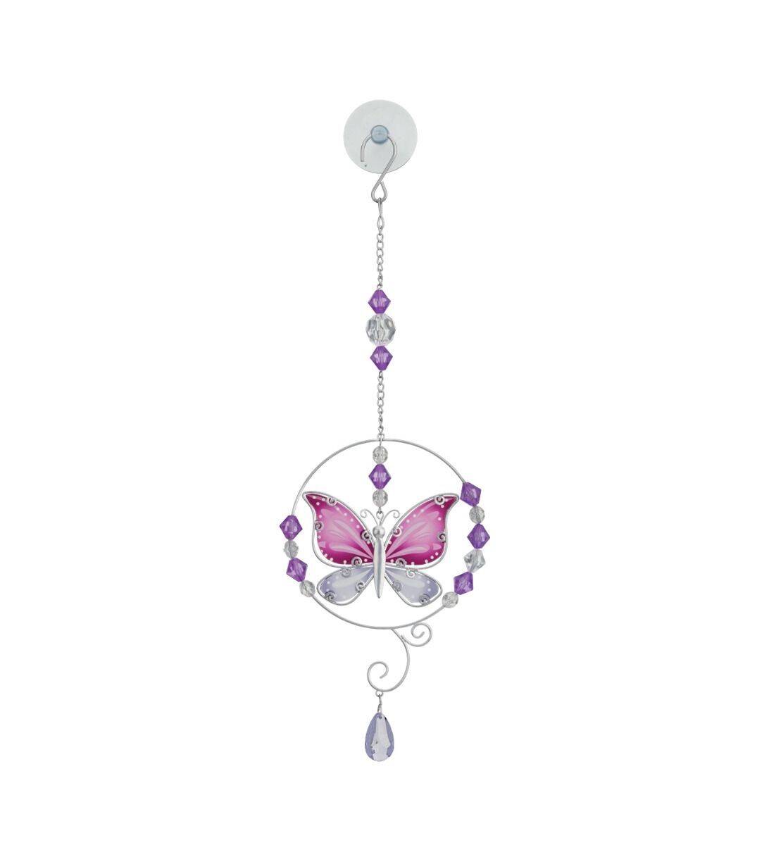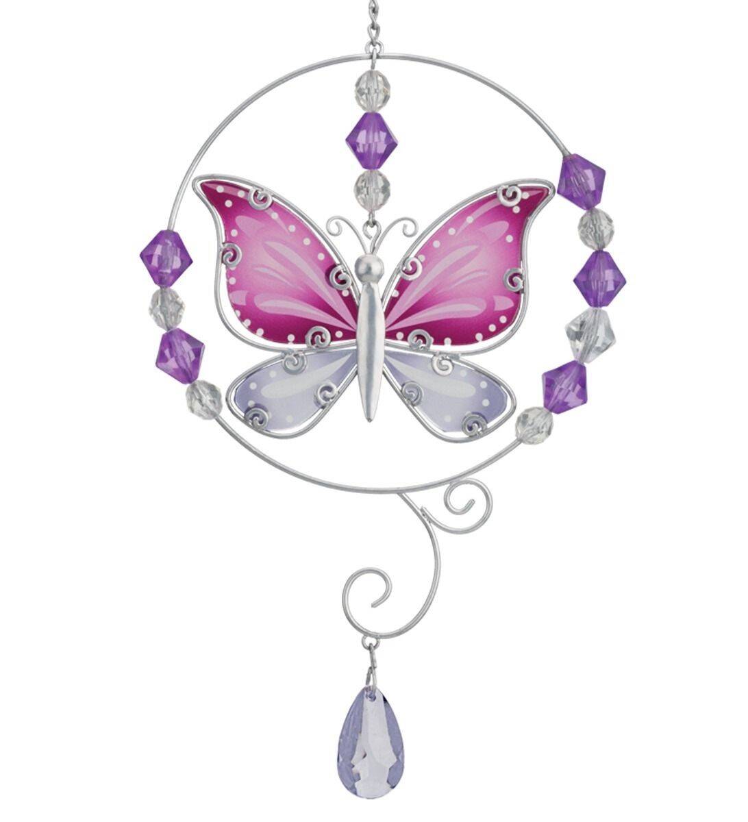 Sparkling colored glass and metal garden icons with hanging acrylic jewels. Hang from the detachable hook or use the strong suction cup to place in a window.