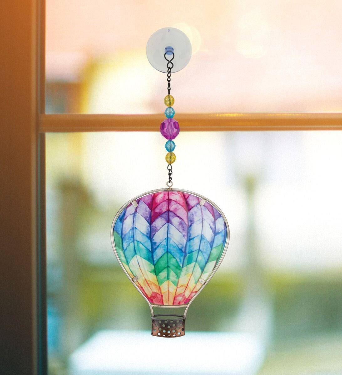 These Sun Catchers capture the light with the hand-painted glass that has a stained glass effect. The metal features are painted with a rich antique copper finish. Faceted beads on the chains add a glistening sparkle.