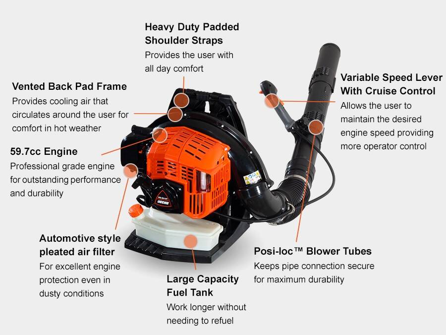 The PB-5810T backpack blower is equipped with a tube-mounted throttle and utilizes the next generation of engine technology. It's designed for a homeowner's light mowing cleanups as well as for wet, heavy leaves encountered by professional landscapers.