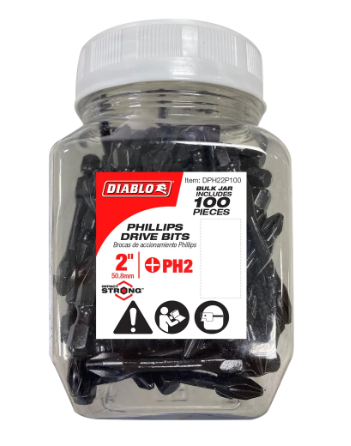 Diablo's driver bit range of Phillips bits delivers maximum performance, extreme durability and up to 50x longer life when installing and removing fasteners. An optimized tip design provides a strong, precise grip that reduces wear, stripping and slippage. Torque Resistant Design absorbs torque for less stress at the tip when tightening and removing nuts and screws. This range is Impact Strong™, delivering increased shank stability and durability in cordless and corded impact and drill drivers.