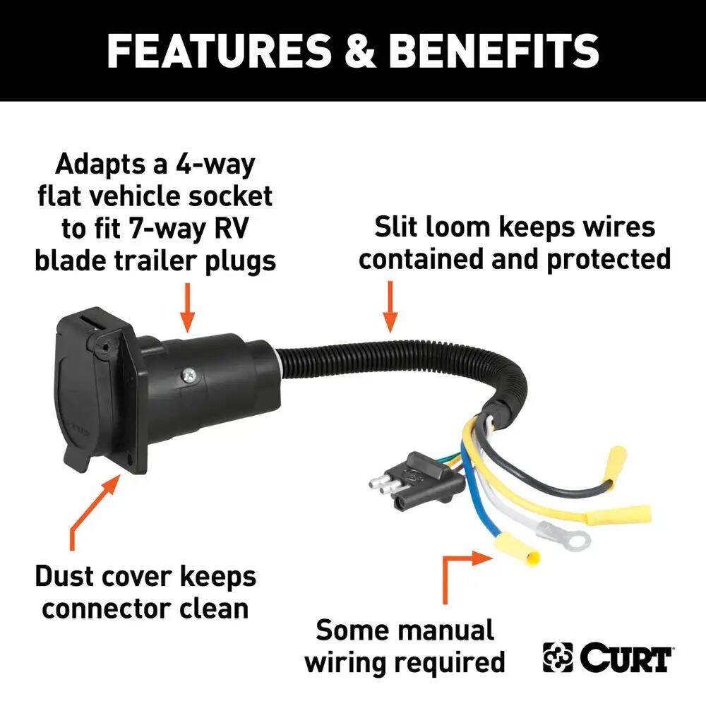This electrical adapter is designed to adapt a 4-way flat vehicle socket to fit a 7-way RV blade trailer plug. It is constructed from quality plastic and requires some splicing. All CURT wiring and electrical products come with a one-year limited warranty to give you the assurance you need to tow with confidence.Specifications