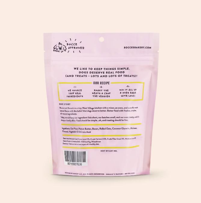 Ingredients Oat Flour, Peanut Butter, Bacon, Rolled Oats, Coconut Glycerin, Molasses, Flaxseed, Vegetable Oil, Citric Acid