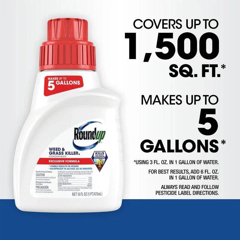 Take control of your outdoor space with Roundup® Weed & Grass Killer? Concentrate. It kills tough weeds and grasses to the root, including dandelion, large crabgrass, poison ivy, clover (red & white), spotted spurge, and other broadleaf weeds. It is rainproof in as fast as 30 minutes, produces visible results in hours, and allows you to plant 1 to 30 days after application (see booklet for details). Use Roundup® Weed & Grass Killer? Concentrate in flower beds, around trees, along fences, driveways and walkways, freshly cut woody stumps, in large areas for lawn replacement, garden plot preparation and other areas of your yard. Mix the concentrate according to label directions and spot treat or spray evenly each gallon of spray solution over 300 sq. ft. with a tank or hose-end sprayer. Do not allow people or pets to enter the treated area or touch treated plants until spray has dried. One 16 fl. oz. bottle of Roundup® Weed & Grass Killer? Concentrate makes between 2.6 and 5 gallons (see booklet for mixing instructions) and covers up to 800 to 1,500 sq. ft.