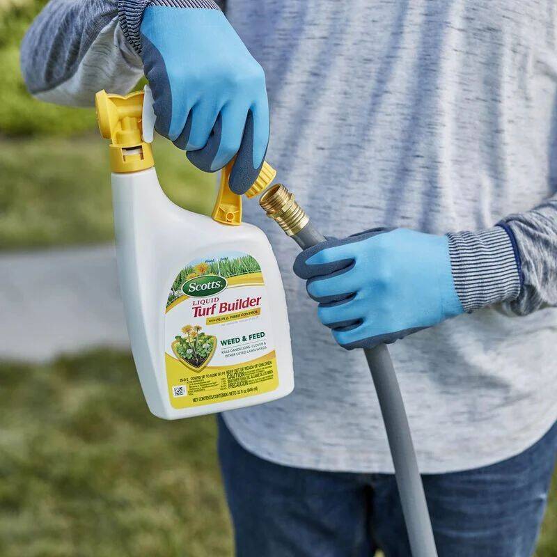 • Simply connect Scotts® Liquid Turf Builder® with Plus 2 Weed Control to a garden hose, turn on water, and spray