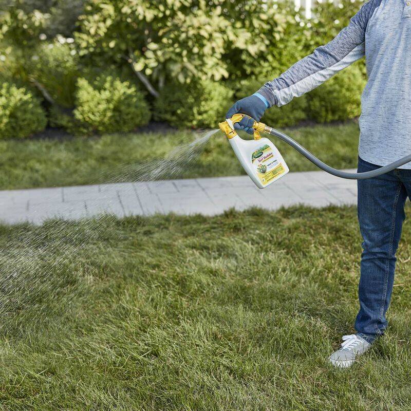 • Liquid weed killer plus fertilizer controls dandelion, clover, ground ivy, henbit, chickweed, plantain, poison ivy, and other broadleaf weeds as listed