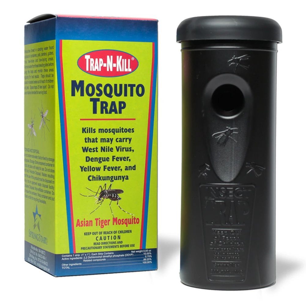 The SpringStar Mosquito Trap-N-Kill is a patented trapping system, originally developed by the US Military. The trap can be used as part of an effective mosquito control program against the types of mosquitoes that can carry diseases such as dengue, chikungunya, West Nile virus, and yellow fever. The Mosquito Trap-N-Kill is a simple black container that mimics the breeding sites for the Aedes mosquito species, and kills females when they enter the trap to lay their eggs. Any eggs that hatch are killed as well. It is easy to assemble, and can provide a low-cost, low-pesticide alternative to fogging practices. Includes 1 trap, 1 landing strip, and 1 pesticide strip.