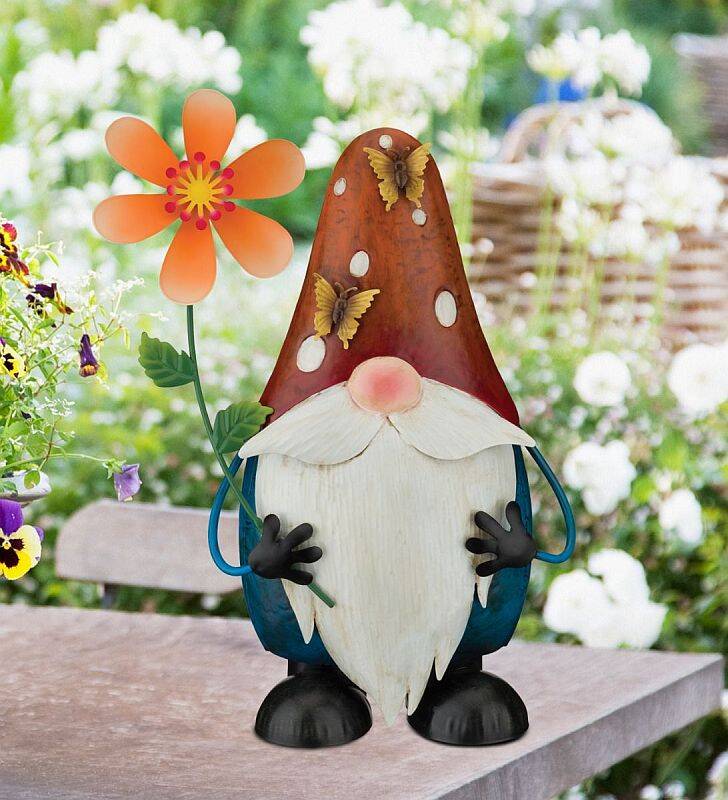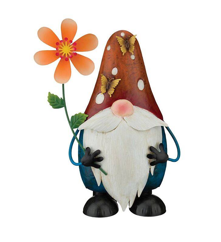 What better way to liven up the garden or home than a friendly Gnome? This rustic finish 3D gnome sports a mushroom hat with butterflies holding a flower that spins in the wind.