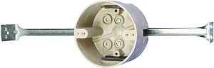 Four inch round ceiling box with universal bar hanger, adjustable bar assembly from 16 to 24 in. 4 in Dia x 2-7/16 in D. Speed clamps, 50 lb. fixture rated. 2 hrs wall and ceiling fire rated, UL listed.