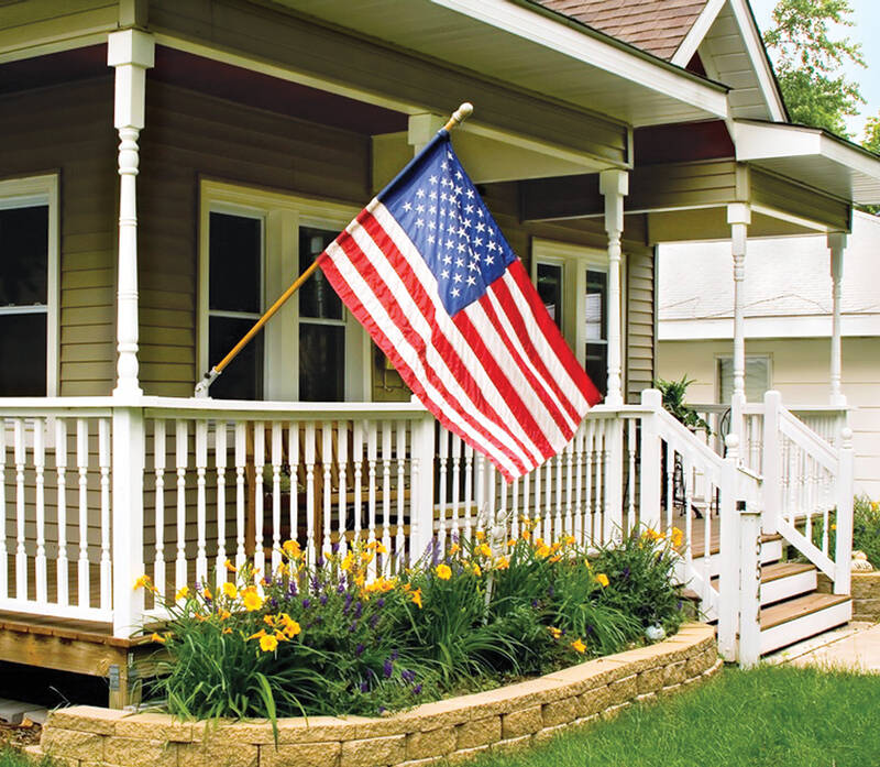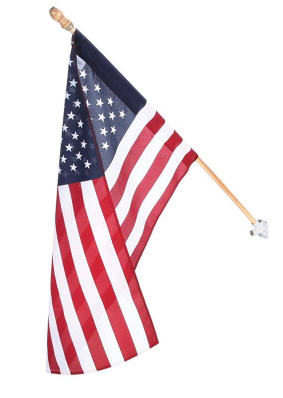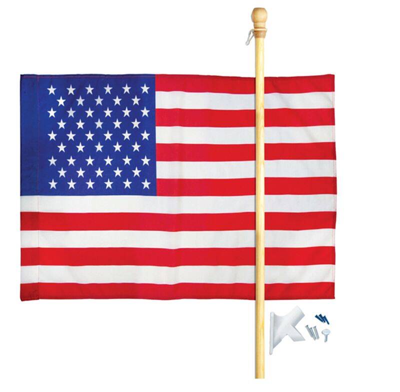 Includes Flag, flag sleeve, 5-foot wood pole, nylon bracket and screws
