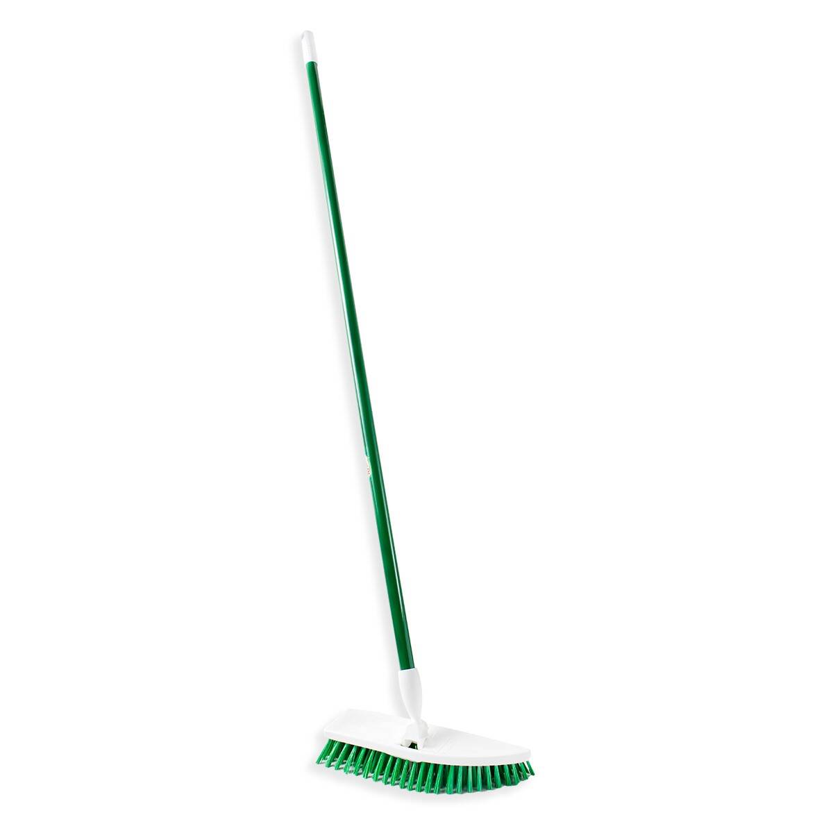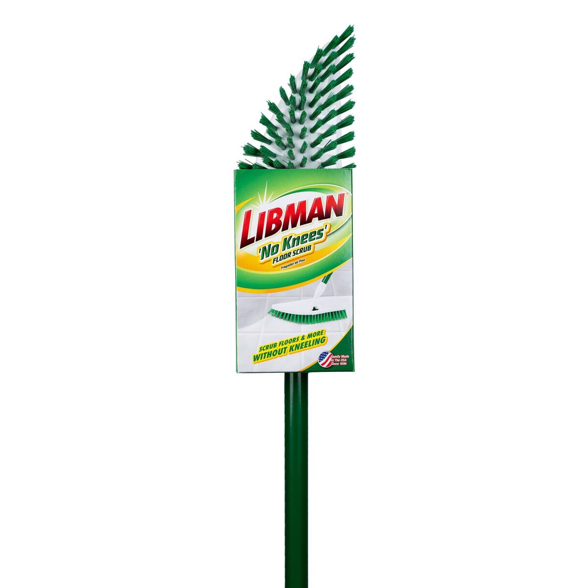 A tough scrubber, attached to a quality Libman handle, allowing for floor scrubbing without hurting your knees. Pointed head to reach corners. Head pivots 180 degrees making reaching tough spots easy. Works great in bathrooms, kitchens and many other rooms.