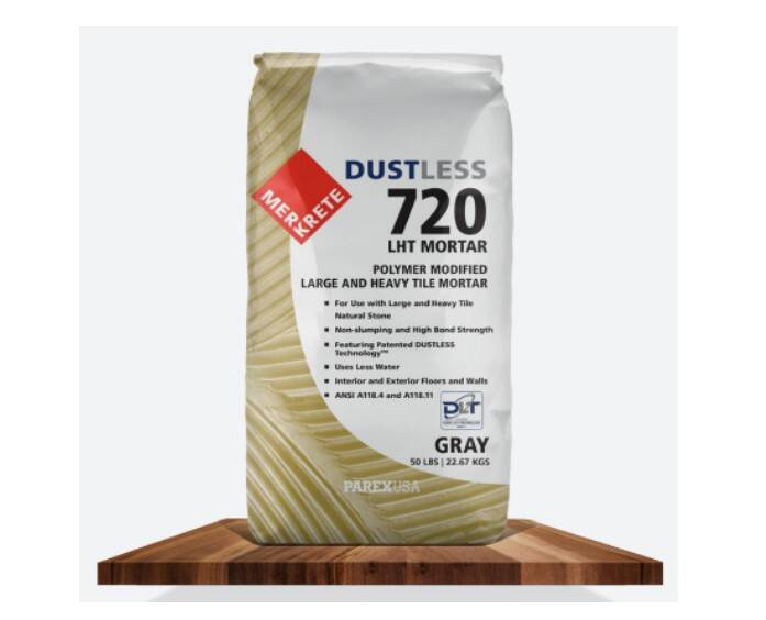 720 DUSTLESS is a professional-grade, polymer-modified LHT mortar for installing large and heavy porcelain, ceramic tile and natural stone to walls and floors in commercial and residential applications. Its innovative DUSTLESS Technology produces significantly less dust than ordinary thin sets promoting cleaner working conditions and reducing mess. 720 DUSTLESS LHT MORTAR uses less water, is creamier and easier to spread.