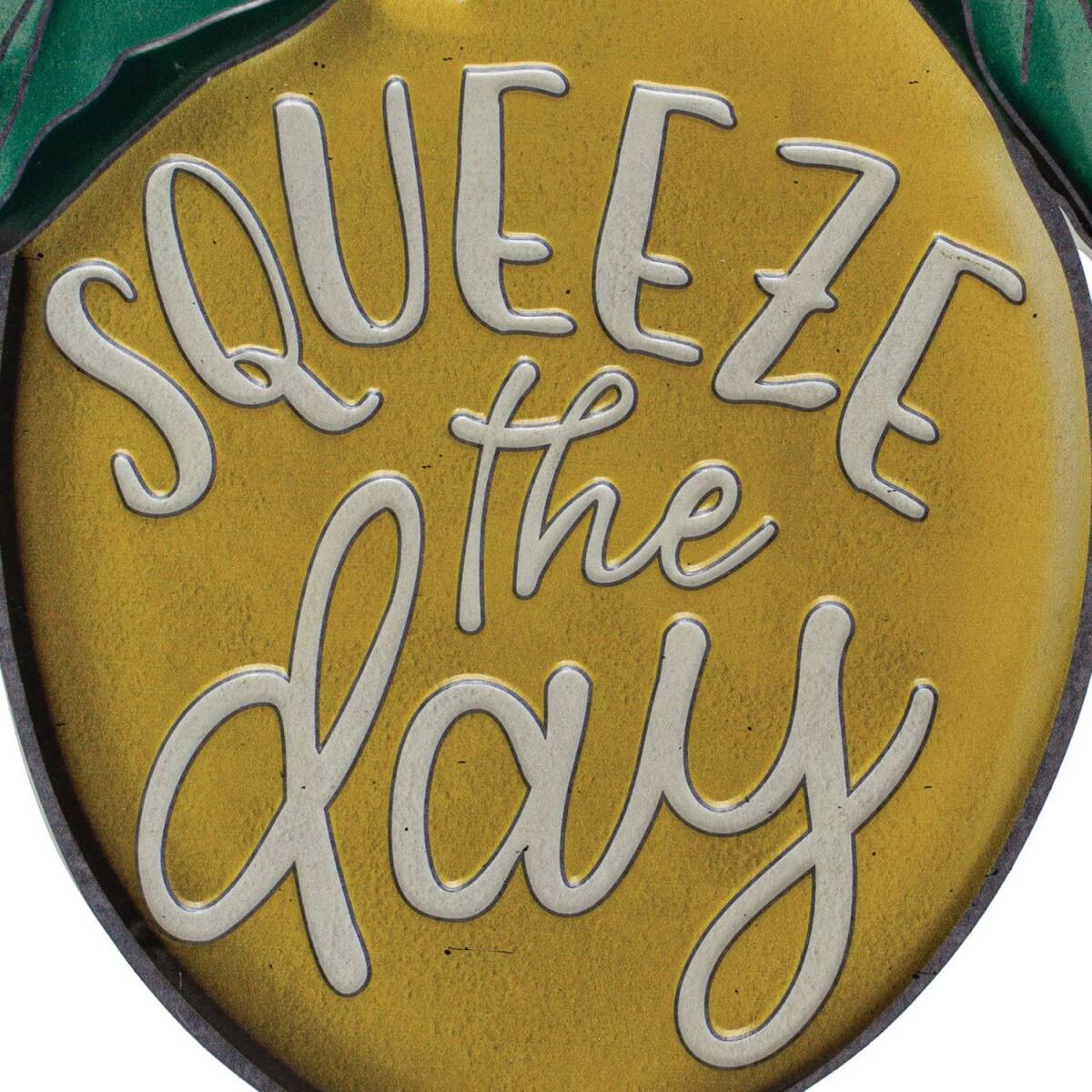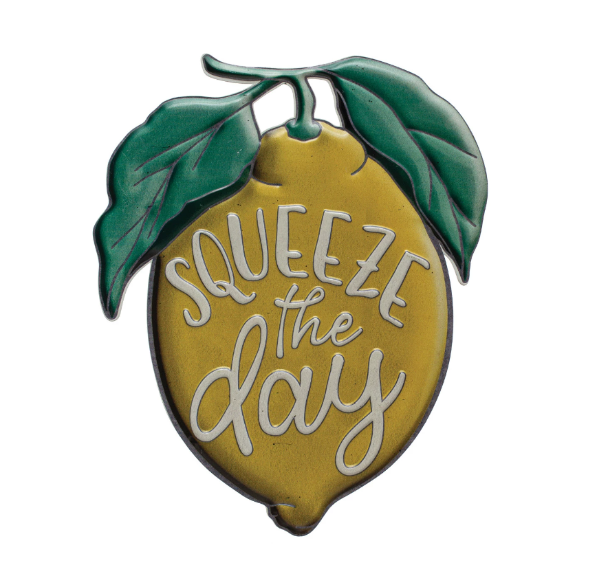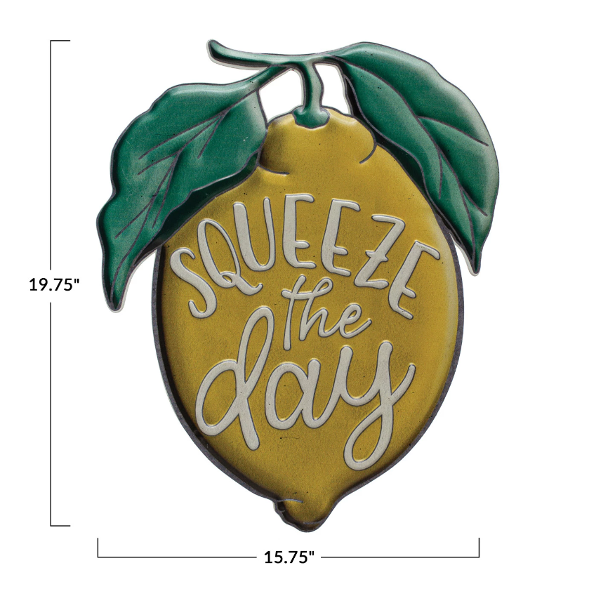 Yellow & Green "Squeeze The Day" Embossed Metal Lemon Wall Hanging