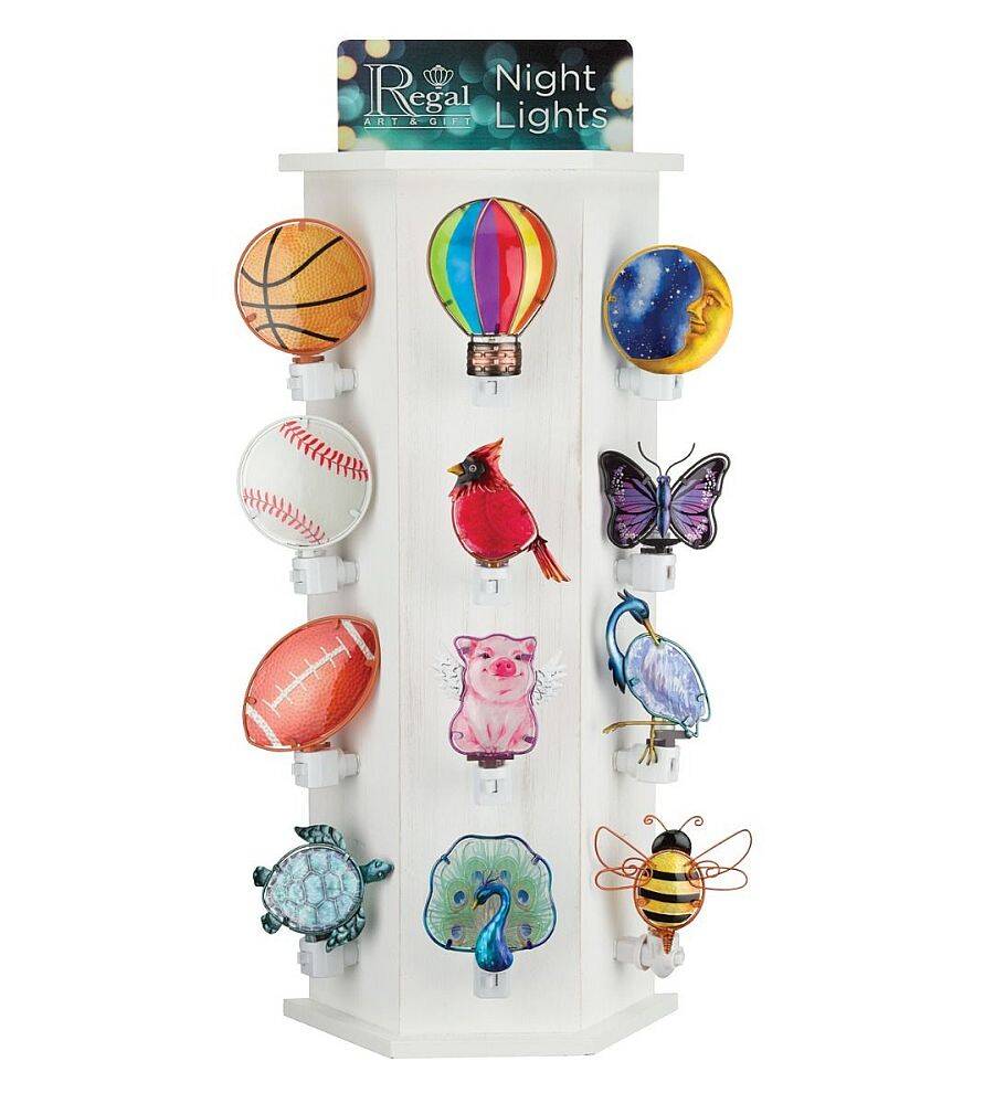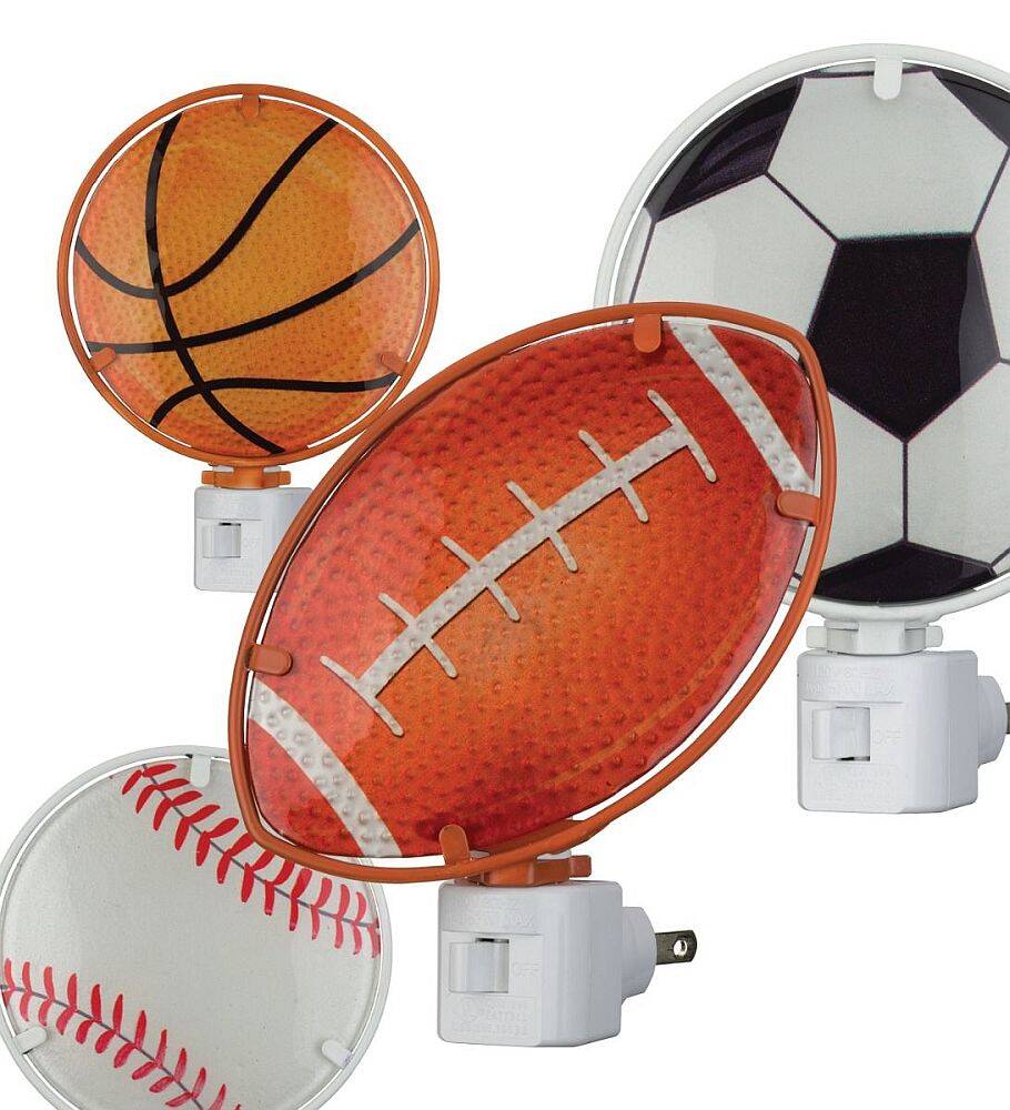 Sport themed colorful glass and metal Night Lights add fun and function to any room or hallway. UL approved. Easy to use on/off switch.  Sport Night Lights come in 4 styles: Baseball, Basketball, Football and Soccer.
