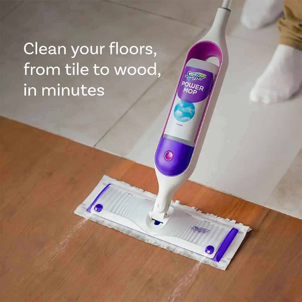 Mop smarter with the Swiffer PowerMop, an all-in-one mopping system that gives you a mop and bucket clean in half the time*. The multi-surface mopping pads have 300+ scrubbing strips that reach deep into grooves and grout to remove sticky spills and daily dirt and grime.