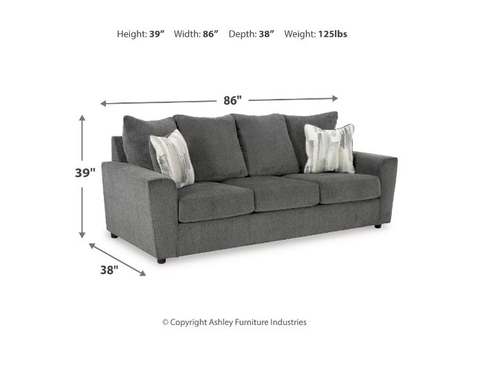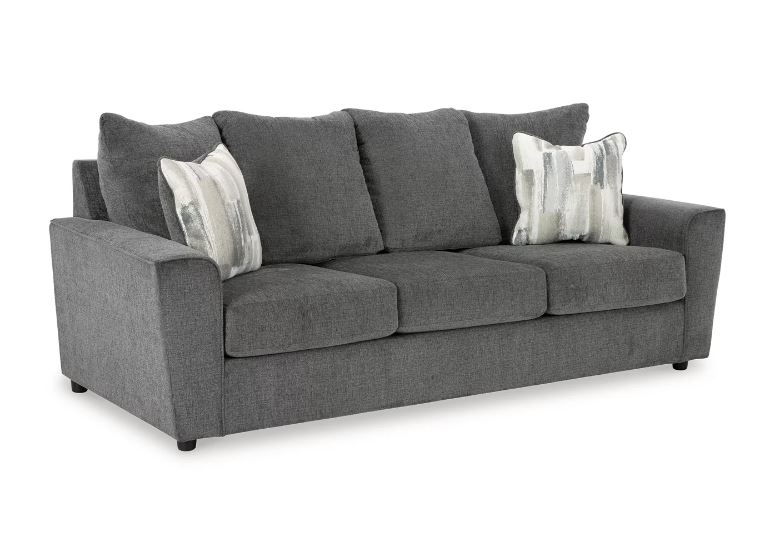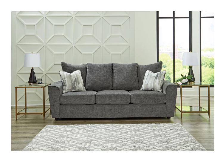 What’s new in neutrals? Shades of gray, of course. Embrace the sophisticated design trend with the gorgeous Stairatt sofa, which offers a clean-lined, contemporary style at a comfortably cool price. Sure to lift your spirits, the plush chenille fabric is fabulously neutral. Contemporary flared arms give it a distinctive flair. This sofa also arrives with two cool brushstroke accent pillows to elevate the taste and comfort level.