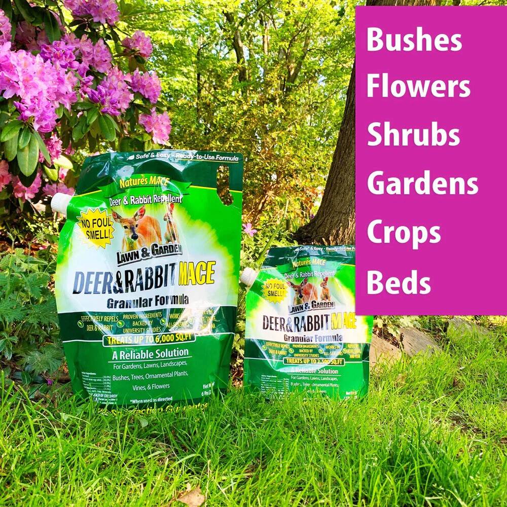 Deer & Rabbit MACE is biodegradable, non-toxic, and easy to use. No mixing or hassle is required. This is the perfect at-home DIY Deer Repellent Solution. Apply directly from the container to quickly repel deer and rabbits. This product does not require rotation with other repellents to be effective. Deer and rabbits naturally avoid our fear, scent, and taste-based technology, so the effectiveness will always work by triggering their instinctive flight response. Our time-released granular formula provides long-lasting, year-round plant protection! It will naturally change animal browsing behavior. With regular application, on a 30 to 60-day rotation, you will save shrubs, trees, bushes, vines, and plants by training deer and rabbits to stay clear of your landscaped and garden areas.