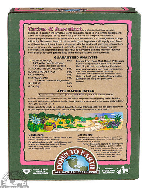 Down To Earth Cactus and Succulent is a blended fertilizer specially designed to support the keystone plants commonly found in arid climate gardens and water-wise xeriscapes. These fascinating specimens are adapted to withstand challenging environmental stresses and utilize diverse tactics to manage water storage efficiently. This robust blend of natural and organic ingredients will supply succulents of all types, including cactuses and agaves, with the nutritional backbone to keep them growing strong and producing beautiful blooms. At the same time, improving soil conditions and encouraging their extensive root systems can help maintain fabulous conservation focused gardens filled with striking cactuses and succulents.