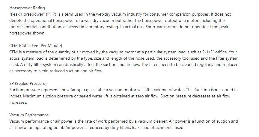 *Tank capacity refers to actual tank volume, and does not reflect capacity available during operation. **"Peak Horsepower" (PHP) is a term used in the wet-dry vacuum industry for consumer comparison purposes. It does not denote the operational horsepower of a wet-dry vacuum but rather the horsepower output of a motor, including the motor's inertial contribution, achieved in laboratory testing. In actual use, Shop-Vac motors do not operate at the peak horsepower shown.