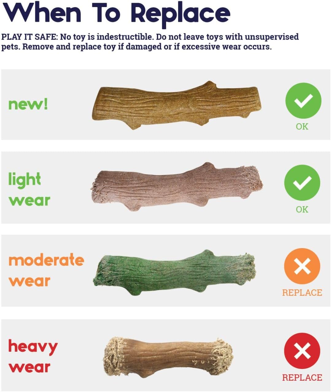 As with all toys, bones and chews, supervise pet. Take the product away when it becomes damaged, worn, sharp-edged, small enough to swallow/choke, etc.