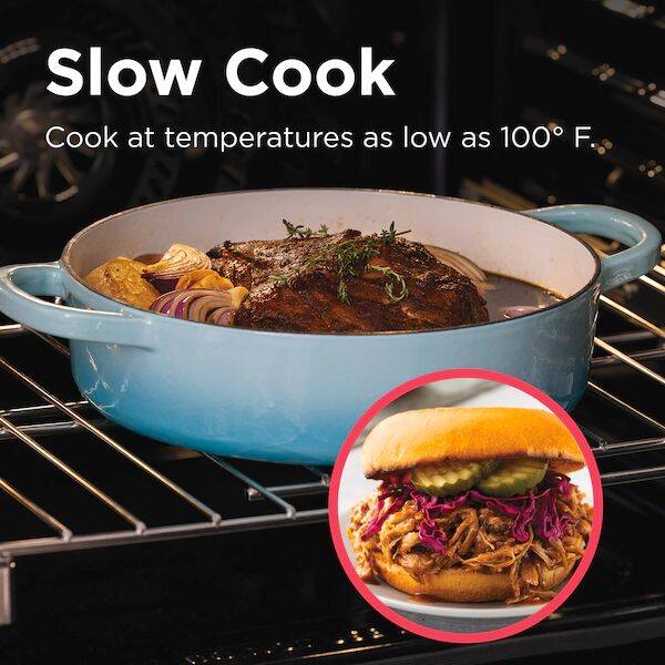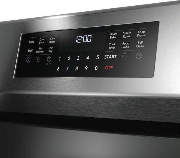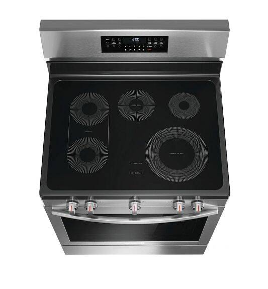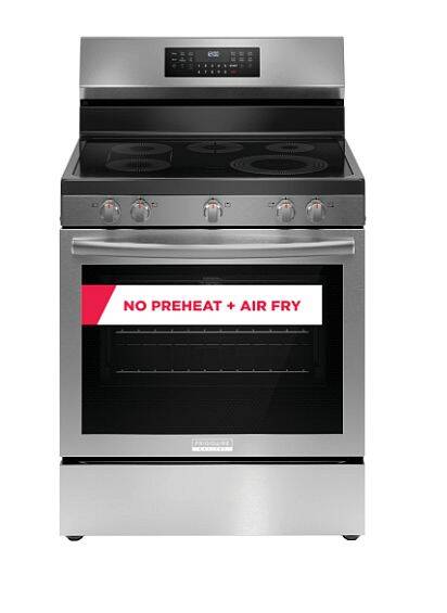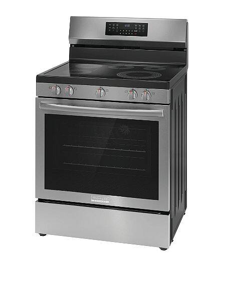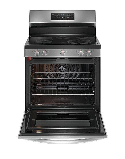 The Frigidaire Gallery 30" Rear Control Electric Range features our most powerful and advanced convection system, Total Convection, enabling so many cooking modes like No Preheat, Air Fry, Slow Cook, Steam Bake, Steam Roast, Air Sous Vide, Convection Roast, Convection Bake and more! The flexible five element cooktop includes a powerful 3,200 Watt EvenTemp™ element and a convenient bridge element - designed to handle all of your cooking needs. Also includes our fingerprint resistant, Smudge-Proof® Stainless Steel finish.