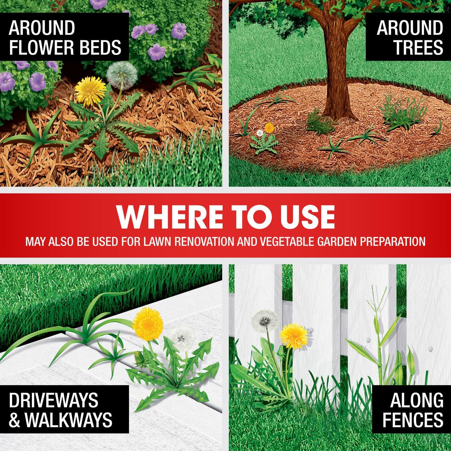 Weeds Controlled Dandelion, large crabgrass, poison ivy, clover (red and white), spotted spurge, and other broadleaf weeds