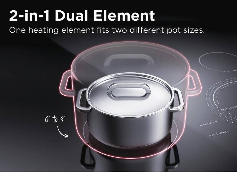 • Get two elements in one with the Dual Expandable element - a 6" inner ring for smaller pots and pans and a 9" outer ring for larger cookware