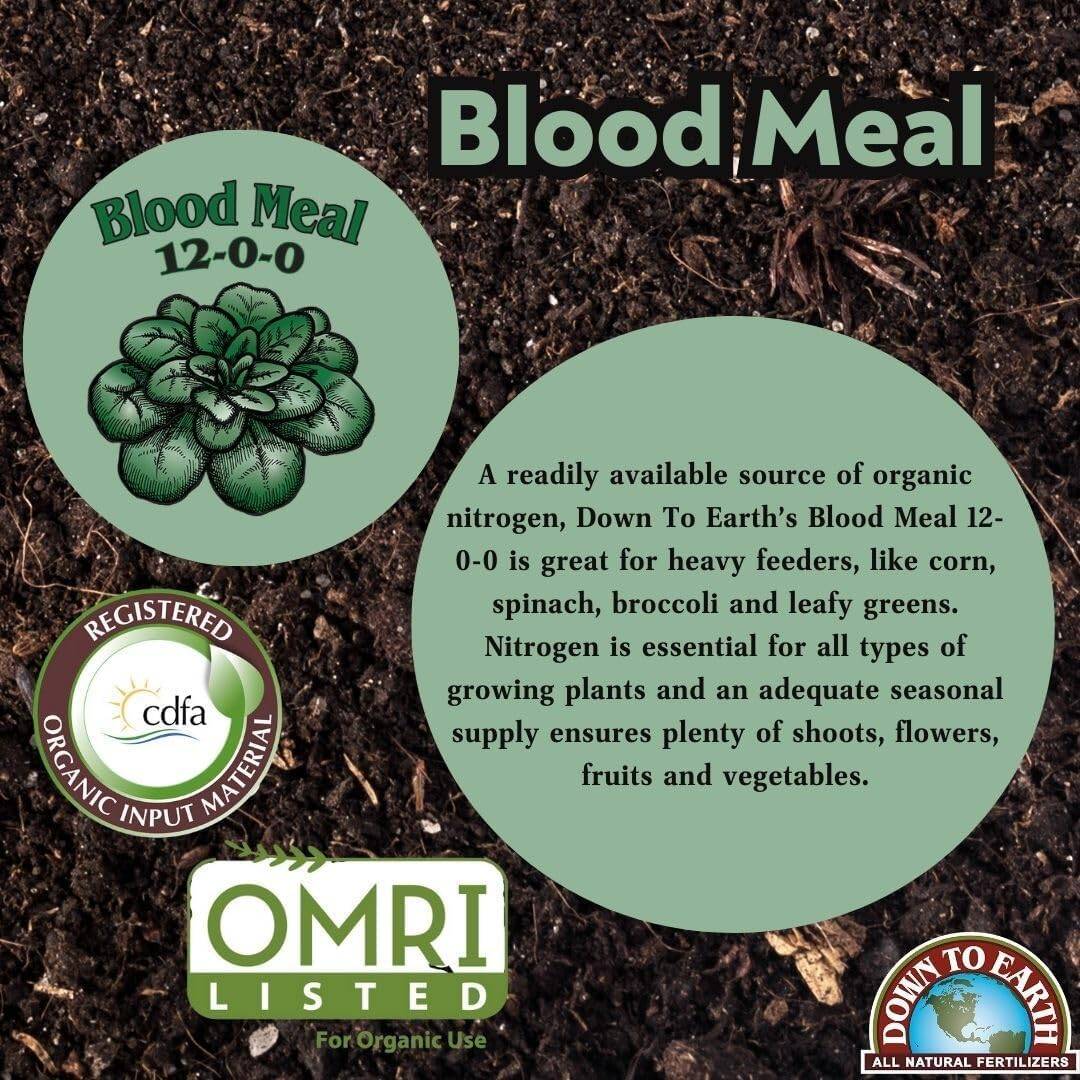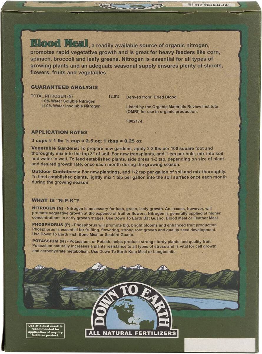 A readily available source of organic nitrogen, Down To Earth’s Blood Meal 12-0-0 is great for heavy feeders, like corn, spinach, broccoli and leafy greens. Nitrogen is essential for all types of growing plants and an adequate seasonal supply ensures plenty of shoots, flowers, fruits and vegetables.