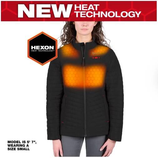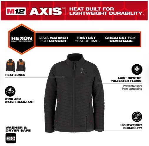 Our M12™ Women’s Heated AXIS™ Jacket delivers HEAT BUILT FOR LIGHTWEIGHT DURABILITY. Powered by Milwaukee’s NEW HEXON HEAT TECHNOLOGY™, this jacket STAYS WARMER FOR LONGER in all temperatures, delivers the FASTEST HEAT UP TIME and offers GREATER HEAT COVERAGE throughout the garment. Whether facing freezing outdoor temperatures or navigating spaces with minimal heat indoors, this jacket adapts to its environment to deliver effective heat in any condition. By integrating HEXON HEAT TECHNOLOGY™ and low-bulk insulation, optimal comfort and mobility are achieved. The hidden battery pass-thru pocket allows for front or back battery placement, increasing versatility depending on the situation. With ground-up developed AXIS™ ripstop fabric, this MILWAUKEE® jacket provides robust protection against the elements without sacrificing movement. Our Milwaukee® Heated Gear is developed in collaboration with feedback from users across the trades through continuous jobsite research.
