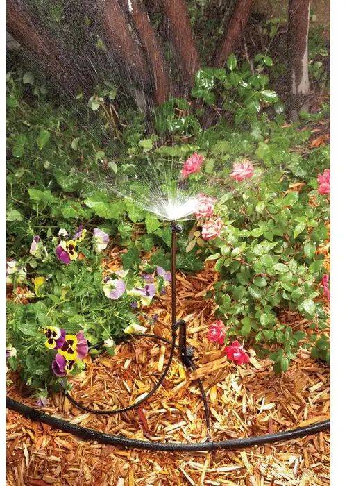 Apply drip watering efficiency in more places around your landscaping with this versatile staked riser with adjustable micro spray flow and height. The riser adjusts up to 18 in. H and the spray adjusts from 0 ft. - 10 ft. throw, allowing you to direct water exactly where you need it in a wide variety of planting areas. It is ideal for taller plants such as shrubs and bushes well as for use in flower beds and ground cover where you may want broader coverage. Includes a sturdy 8-in. stake plus 36 in. L of 1/4 in. tubing with barbed fitting for quick attachment to 1/2 in. drip irrigation tubing.