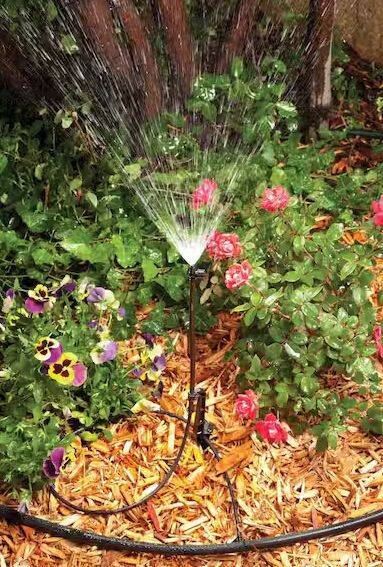 Apply drip watering efficiency in more places around your landscaping with this versatile staked riser with adjustable micro spray. 90-Degree Fan Micro Spray With Tall Adjustable Staked Riser - 0-10-Foot Distance.