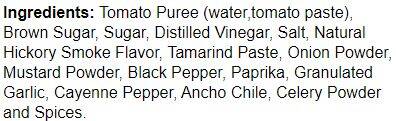 | Ingredients | Tomato Puree (water, tomato paste), Brown Sugar, Sugar, Distilled Vinegar, Salt, Natural Hickory Smoke Flavor, Tamarind Paste, Onion Powder, Mustard Powder, Black Pepper, Paprika, Granulated Garlic, Cayenne Pepper, Ancho Chile, Celery Powder and Spices. |