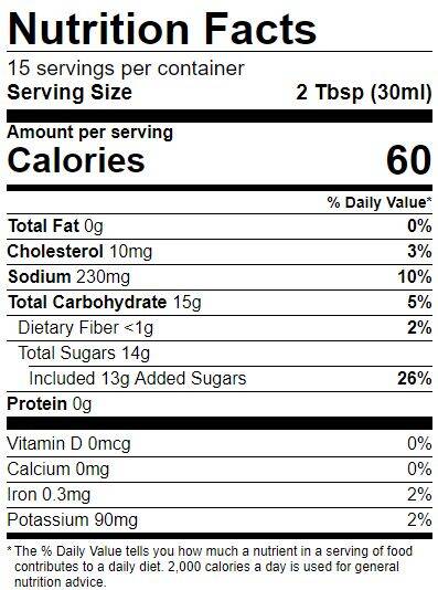 | Nutritional Information | Total Fat 0g (0%), Cholesterol 10mg (3%), Sodium 230mg (10%0, Total Carbohydrate 15g (5%), Dietary Fiber <1g (2%), Total Sugars 14g, Included 13g Added Sugars (26%), Protein 0g, Vitamin D 0mcg (0%), Calcium 0mg (0%), Iron 0.3mg (2%), Potassium 90mg (2%) |