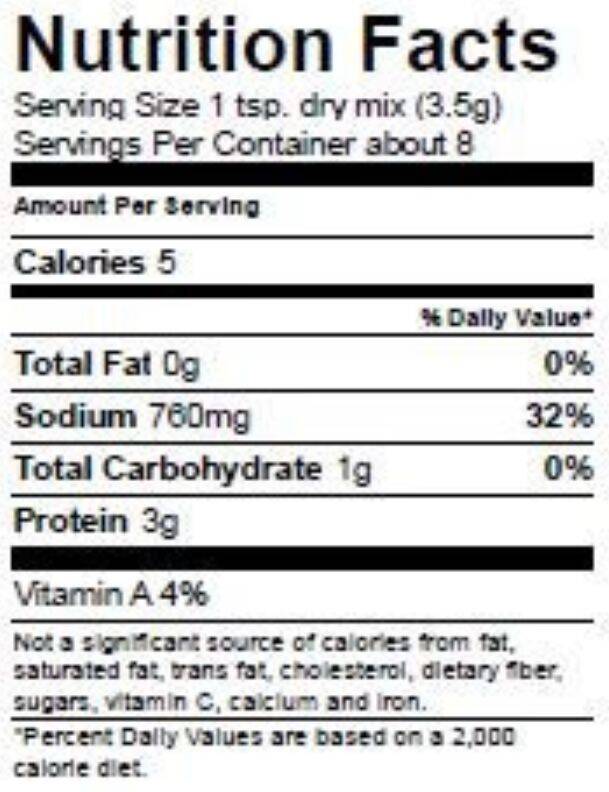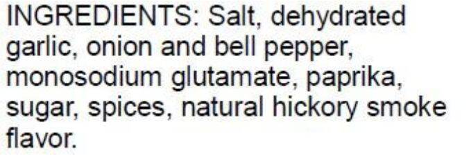 Ingredients Salt, dehydrated garlic, onion and bell pepper, monosodium glutamate, paprika, sugar, spices, natural hickory smoke flavor