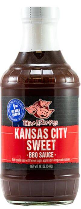 Three Little Pigs Kansas City Sweet BBQ Sauce is a sweet, smokey classic tomato-based sauce. Great paired with chicken and pork, this sauce is enhanced with natural smoke flavor and sugars. Going to Kansas City! Kansas City here I come!