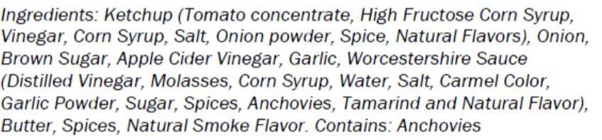 | Ingredients | Ketchup (Tomato concentrate, High Fructose Corn Syrup, Vinegar, Corn Syrup, Salt, Onion Powder, Spice, Natural Flavors), Onion, Brown Sugar, Apple Cider Vinegar, Garlic, Worcestershire Sauce (Distilled Vinegar, Molasses, Corn Syrup, Water, Salt, Caramel Color, Garlic Powder, Sugar, Spices, Anchovies, Tamarind and Natural Flavor), Butter, Spices, Natural Smoke Flavor. Contains: Anchovies |