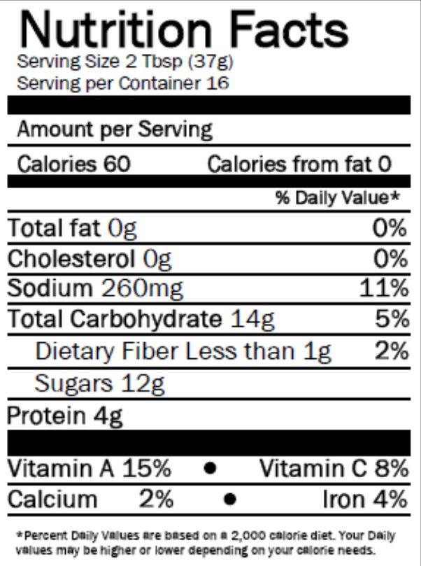 | Nutritional Information | Total fat 0g (0%), Cholesterol 0g (0%), Sodium 260mg (11%), Total Carbohydrate 14g (5%), Dietary Fiber Less than 1g (2%), Sugars 12g, Protein 4g, Vitamin A 15%, Vitamin C 8%, Calcium 2%, Iron 4% |