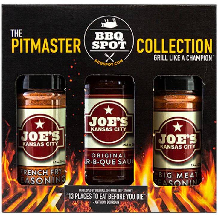 | Includes | Joe's Kansas City French Fry Seasoning (6.5 oz / 184 g), Joe's Kansas City Original Bar-B-Que Sauce (20.5 oz / 581 g), Joe's Kansas City Big Meat Seasoning (7.5 oz. /213 g) |