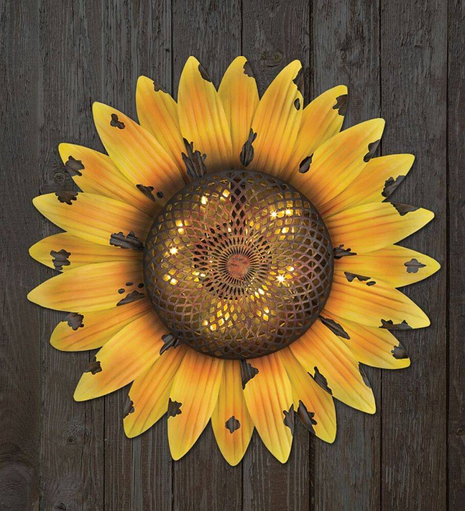 This amazing outdoor Sunflower Wall Decor has spiraling metal cut outs that light up at night with a string of solar powered LED lights. Sets your outdoor space with a warm, mellow mood.