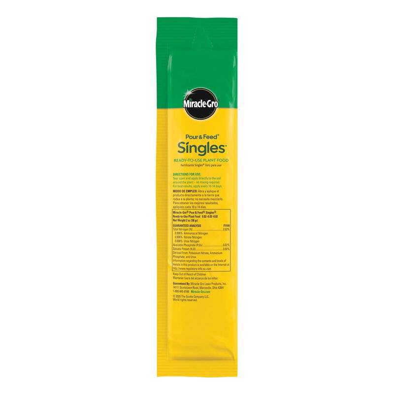 Life can be busy, but that doesn't mean you should skip out on feeding your potted plants. That's why we developed Miracle-Gro Pour and Feed Singles, a ready-to-use plant food that doesn't require any mixing or measuring before use. Our liquid plant food makes feeding your indoor and outdoor potted plants quick and easy. Each packet of Miracle-Gro Pour and Feed Singles is pre-measured with the right amount of plant food to instantly feed any plant type - flowers, succulents, edibles, you name it. All you have to do is tear open the top of the packet and pour the plant food directly onto the soil that surrounds the base of your plant. For best results, feed your plants every 10-14 days to help them grow vibrant and strong. Your plants deserve to thrive as much as you do. Help them reach their full potential with Miracle-Gro® Pour and Feed® Singles.